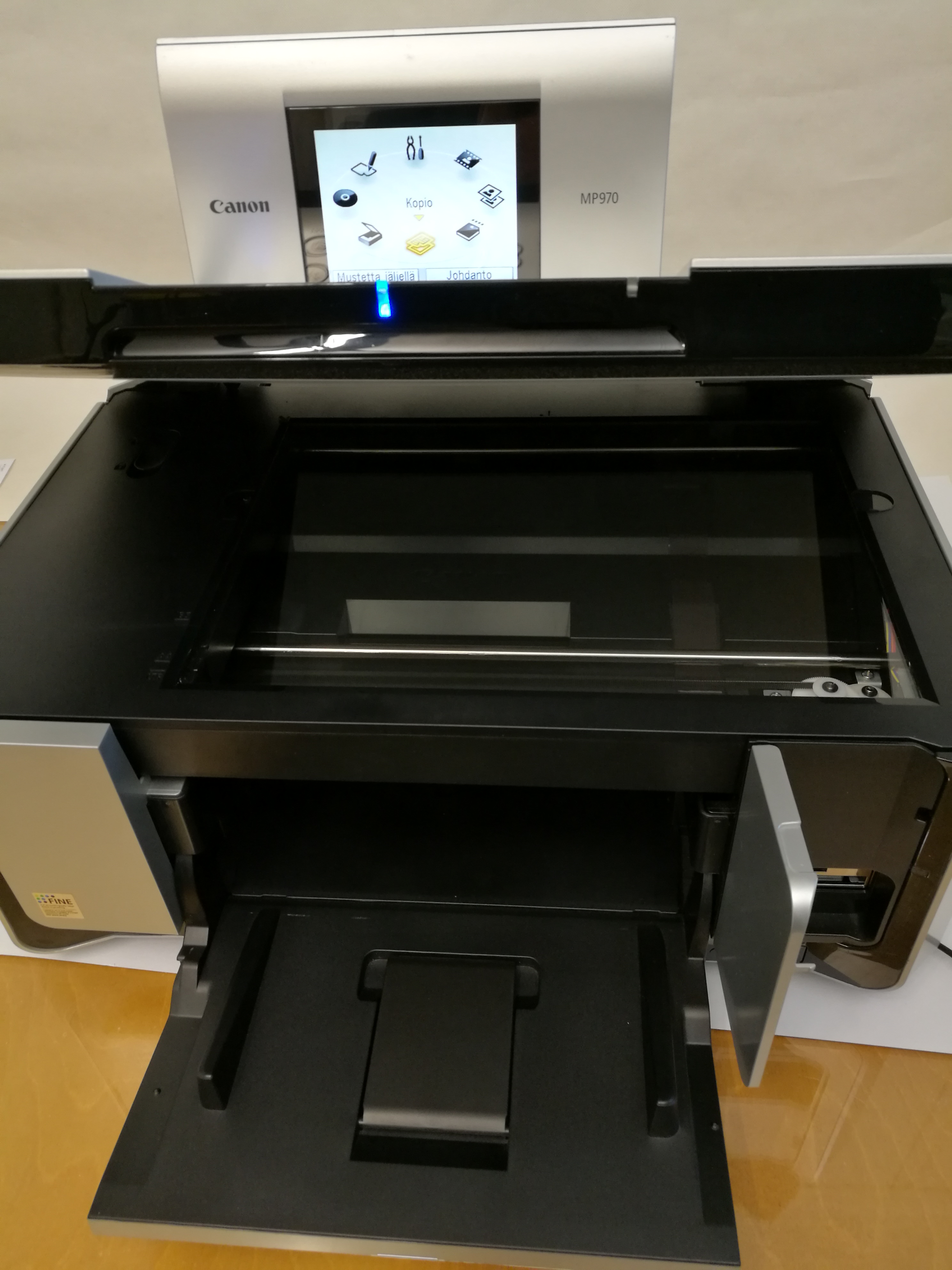 Canon Pixma MP970 monitoimilaite. Toiminnot: tulostus, skannaus, suoratulostus kamerasta, muistikortilta, 35 mm:n filmiltä ja matkapuhelimesta.