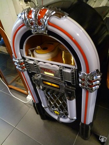 Jukebox, radio ja cd-soitin. Mitat korkeus 106 levys 56 ja syvyys 29cm.